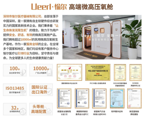 安全始终是愉尔氧舱的核心优势。舱体采用高强度复合钢材料,配备“八重安全防护+八重空气过滤”系统,全面保障使用过程的安全与舒适。作为通过ISO13485医疗器械质量管理体系认证的国家高新技术企业,深圳愉尔医疗的微高压氧舱已获得欧盟CE、美国FCC等国际认证,并成功进入欧美市场,其制造与安全标准严格遵循国际主流规范。